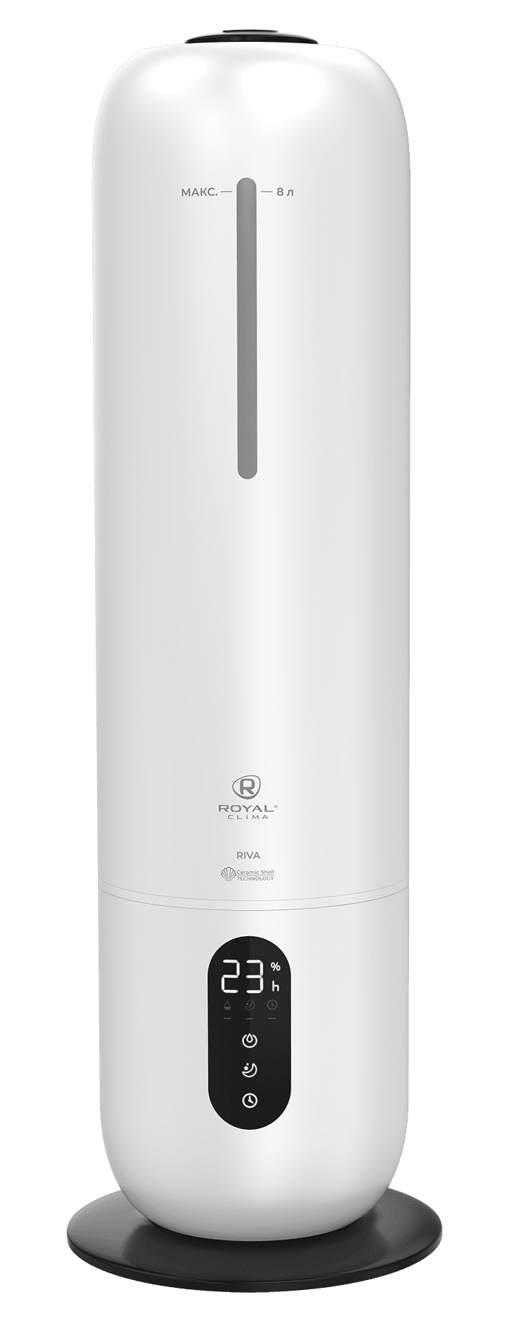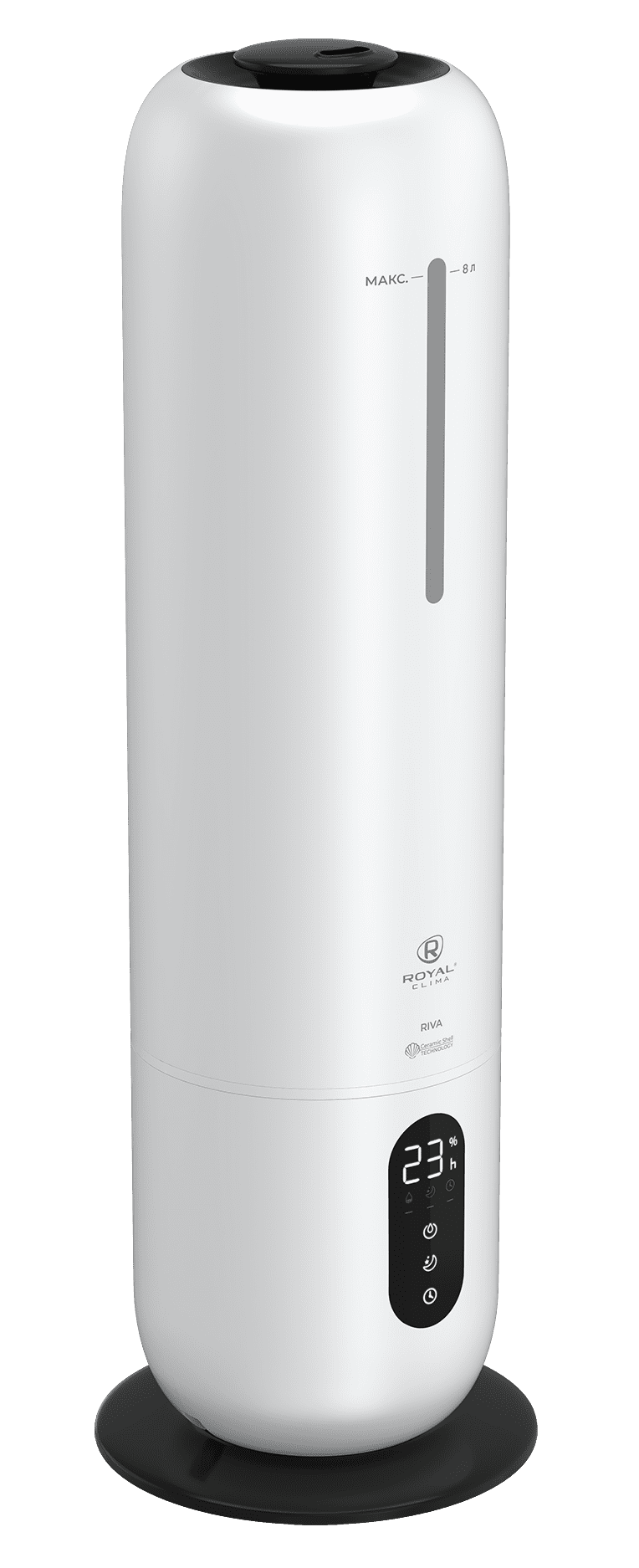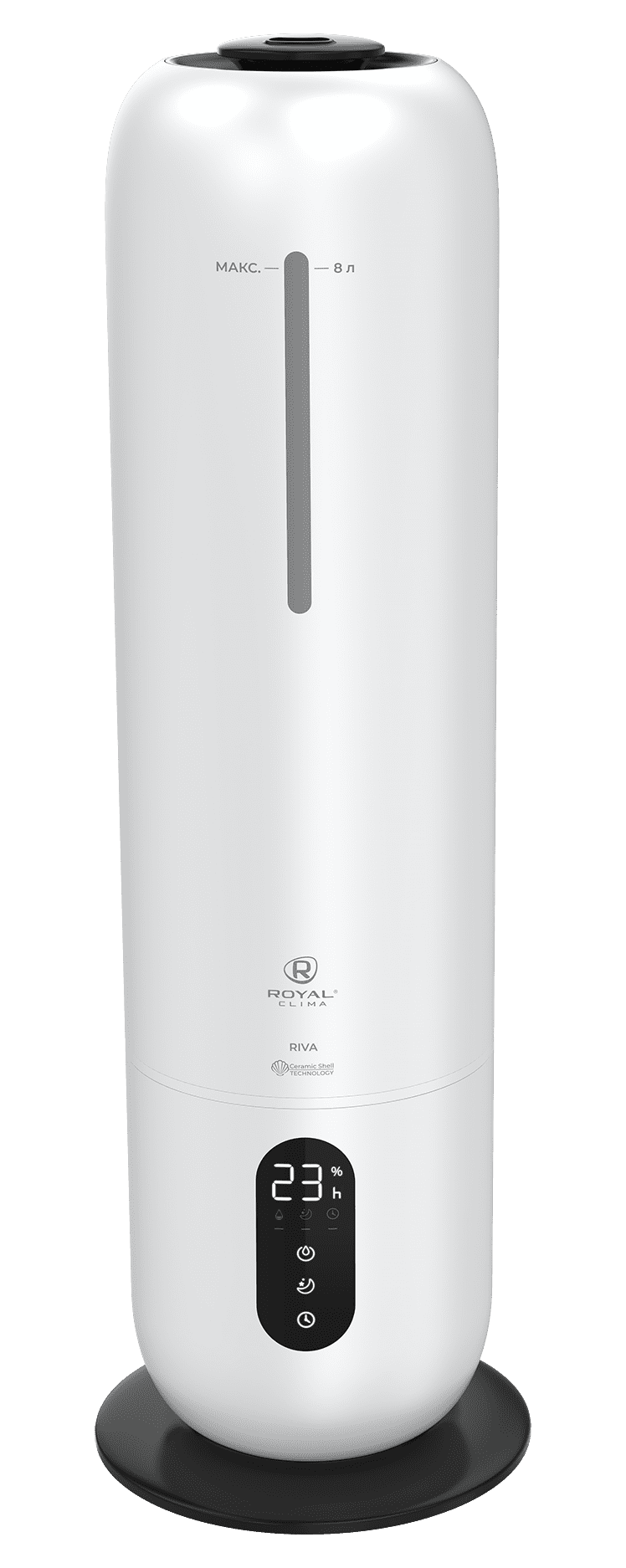 Увлажнитель воздуха RIVA от ROYAL CLIMA (Роял Клима) обладает революционным увеличенным объемом резервуара для воды: 8 литров. Работа без долива воды от 26 часов. Максимальная интенсивность увлажнения воздуха 300 мл/ч.